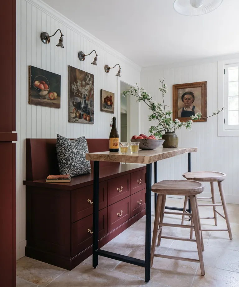 ‘By using a counter-height table, we maximized a small space. The table doubles as a work station, and the drawers in the bench provide ample storage for less commonly used items. And the bench is a prime place for our young nieces, Claire and Anna, to park as we make them pancakes,’ he adds.